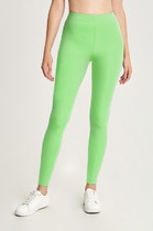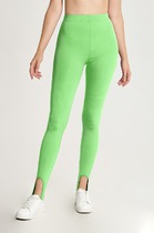 Леггинсы женские из однотонного трикотажного полотна. По боку вдоль ножки лампас из кожи переходящий вверху в фигурную кокетку. По шву лампаса и кокетки - отделочная строчка. Верх изделия обработан поясом с эластичной тесьмой внутри.