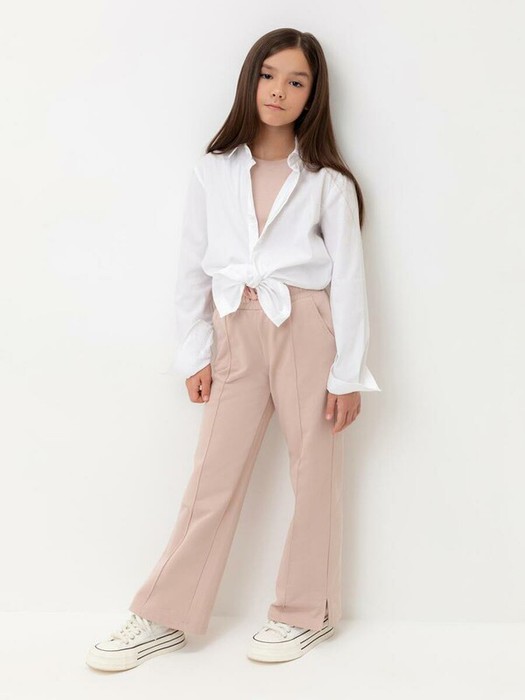 Прямые брюки со стрелками для девочки из мягкого петельчатого трикотажа. Эластичный пояс на резинке регулируется по ширине с помощью шнурка. По бокам два удобных кармана. Спереди застроченные стрелки.