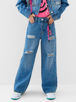 Джинсовые брюки-бананы для девочки с удобным поясом на резинке. В области бёдер и колен - эффект потёртости. По бокам и сзади карманы. На поясе нашивка из эко кожи.