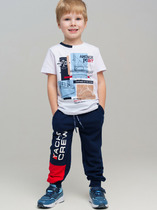 Трикотажные брюки для мальчика из высококачественного трикотажного полотна супрем. Эластичный пояс на резинке регулируется по ширине с помощью шнурка, по бокам два удобных кармана, внизу эластичные манжеты.