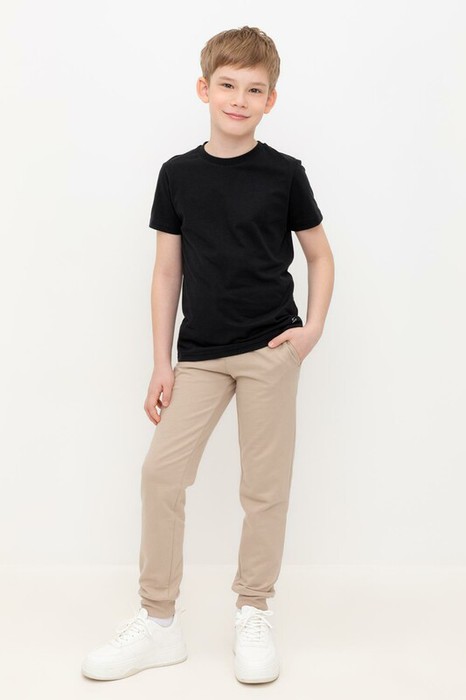 Трикотажные брюки для мальчика из петельчатого футера. Эластичный пояс на резинке регулируется по ширине с помощью шнурка, по бокам два удобных кармана, внизу эластичные манжеты.
