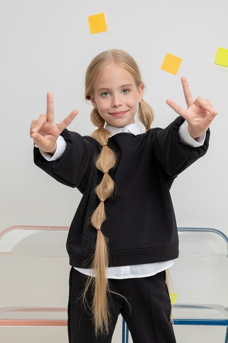 Джемпер школьный для девочки. Произведен из мягкого трикотажного футера трёхнитки. В составе 80% натурального хлопка и 20% полиэстера, при этом полиэстер ввязан внутрь по особой технологии и не соприкасается с кожей.