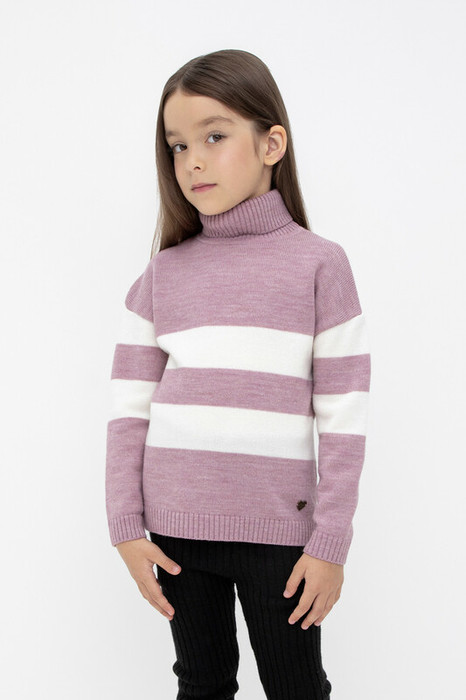 Вязаный джемпер для девочки из мягкой полушерстяной пряжи. Высокий воротник с отворотом хорошо защищает от холода. Длинные рукава с манжетами. Внизу эластичный пояс. Изделие сохраняет форму и стойкий цвет после многочисленных стирок.