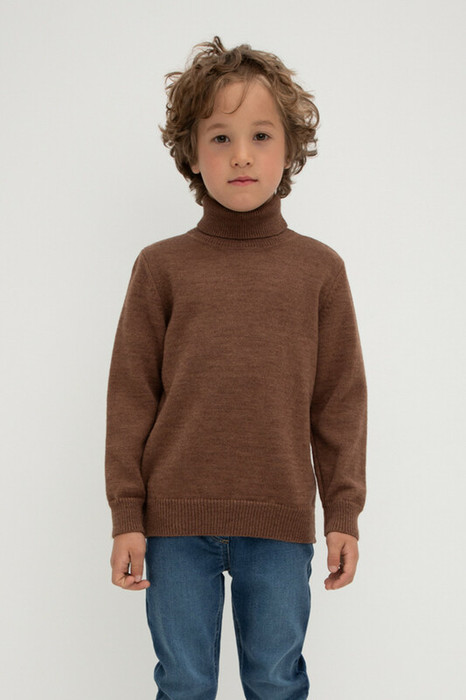 Вязаный джемпер для мальчика из мягкой полушерстяной пряжи. Высокий воротник с отворотом хорошо защищает от холода. Длинные рукава с манжетами. Внизу эластичный пояс. Изделие сохраняет форму и стойкий цвет после многочисленных стирок.