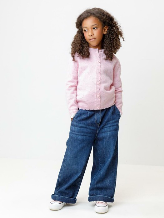 Вязаный кардиган с ажурными сердечками для девочки. Изготовлен из мягкой полушерстяной пряжи. Застёгивается на планку с пуговицами. Длинные рукава, планка и низ изделия с ажурной каймой по краям. Изделие сохраняет форму и стойкий цвет после многочисленных стирок.