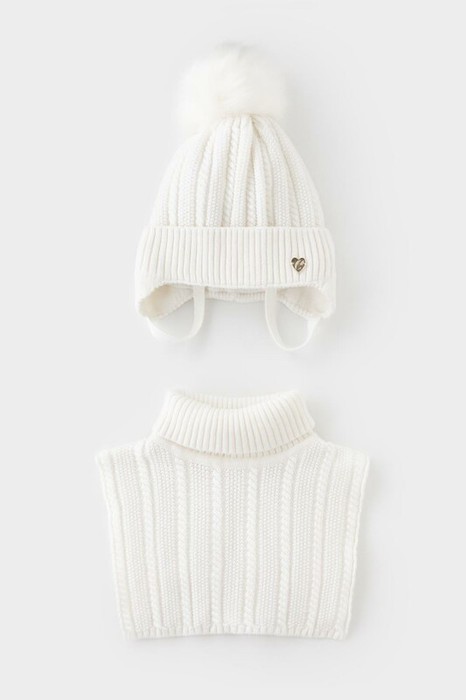 Комплект для девочки: шапка и манишка из полушерстяной пряжи. Шапка на завязках с синтепоновым утеплителем. Подклад из натурального хлопка. Полностью закрывает голову, уши и шею, защищая ребёнка от холодного воздуха и ветра. На макушке помпон. Манишка с высоким воротником с эластичным отворотом.