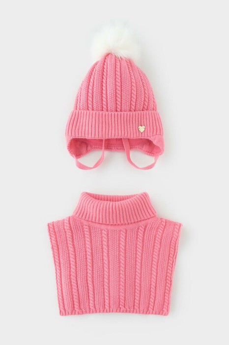 Комплект для девочки: шапка и манишка из полушерстяной пряжи. Шапка на завязках с синтепоновым утеплителем. Подклад из натурального хлопка. Полностью закрывает голову, уши и шею, защищая ребёнка от холодного воздуха и ветра. На макушке помпон. Манишка с высоким воротником с эластичным отворотом.