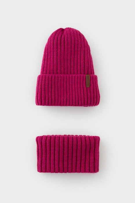 Комплект детский: шапка и снуд из полушерсти. Тёплая вязаная шапка с отворотом на подкладе из флиса. Украшена нашивкой из искусственной кожи. Узкий снуд без отворотов вокруг шеи. Изделие сохраняет форму и стойкий цвет после многочисленных стирок.