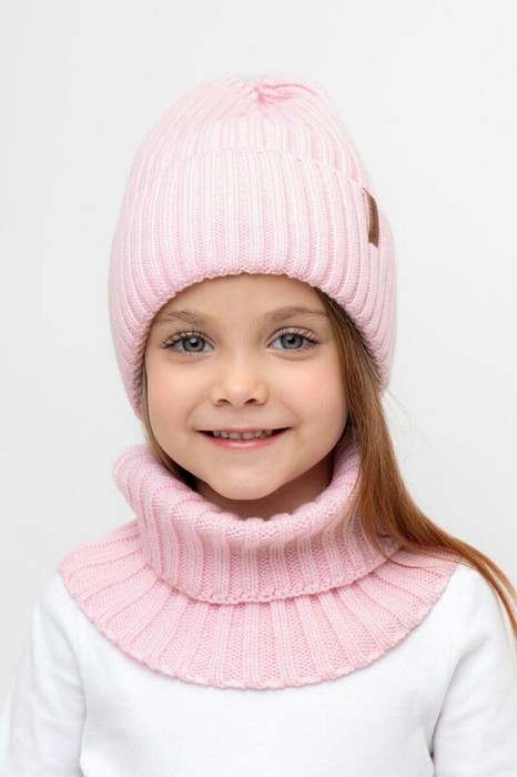 Комплект детский: шапка и снуд из полушерсти. Тёплая вязаная шапка с отворотом на подкладе из флиса. Украшена нашивкой из искусственной кожи. Узкий снуд без оборотов вокруг шеи. Изделие сохраняет форму и стойкий цвет после многочисленных стирок.