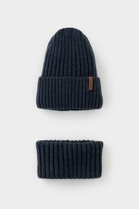 Комплект детский: шапка и снуд из полушерсти. Тёплая вязаная шапка с отворотом на подкладе из флиса. Украшена нашивкой из искусственной кожи. Узкий снуд без отворотов вокруг шеи. Изделие сохраняет форму и стойкий цвет после многочисленных стирок.