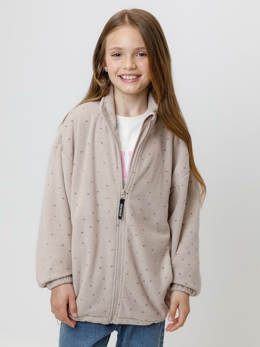 Флисовая куртка для девочки. У изделия высокий воротник и застёжка на молнию с мягкой защитой шеи и подбородка. По бокам два кармана. Рукава собраны на резинку. Низ изделия регулируется по ширине с помощью эластичной утяжки со стопперами. Куртка сохраняет цвет и форму после многократных стирок.