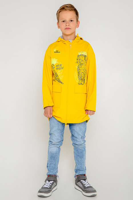 Куртка-ветровка без утеплителя. Рекомендованный температурный режим: от +15° и выше без поддевы и от +8° и выше с поддевой. Верхняя мембранная ткань 1000/1000 с тефлоновым покрытием отталкивает воду и грязь и обладает «дышащими» свойствами. Подкладка из 100% полиэстера. Впереди украшена крупными принтами. Застёгивается на молнию, предусмотрена защита подбородка. Дополнительная ветрозащитная планка внутри. Капюшон не снимается, утгивается с помощью эластичного шнурка со стопперами. Манжеты регулируются по ширине с помощью липучек. Накладные карманы с клапанами на кнопках. Светоотражающие элементы служат для безопасности в тёмное время суток.