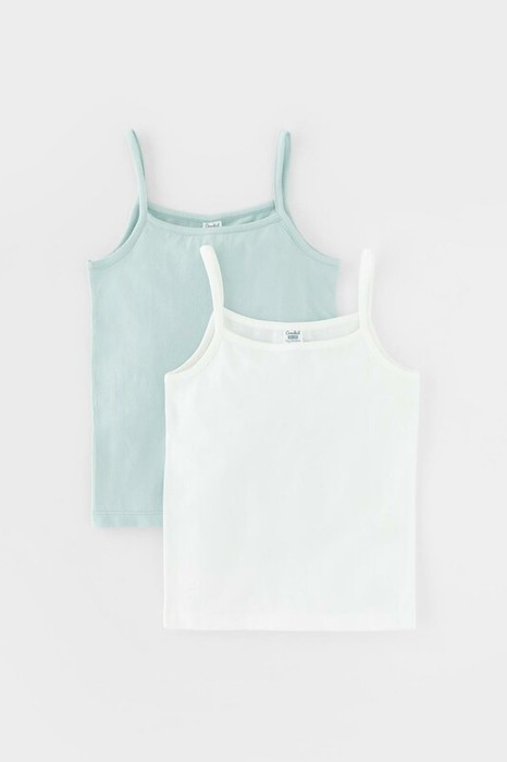 Трикотажные майки в комплекте 2 шт на тонких бретелях из однотонного супрема с эластаном, горловина спинки и проймы обработаны кантом, по горловине полочки декоративная эластичная тесьма и атласный бантик. Сохраняют цвет и форму после многократных стирок. Все трикотажные полотна производятся в соответсвии с нормами Швейцарского сертификата ЭкоТекс.