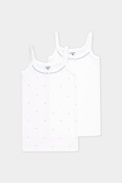 Трикотажные майки в комплекте 2 шт на тонких бретелях из однотонной рибаны, горловина и проймы обработаны кантом, по горловине полочки мережка и атласный бантик. Сохраняют цвет и форму после многократных стирок. Все трикотажные полотна производятся в соответсвии с нормами Швейцарского сертификата ЭкоТекс.