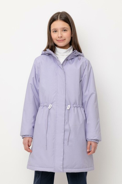 Демисезонное пальто для девочки с утеплителем SEE®: 120 г/м2. Выполнена из мембранной, фактурной ткани с дополнительной тефлоновой обработкой. Данный вид обработки предохраняет изделие от загрязнения и лучше отводит влагу. Подклад из 100% полиэстера. У изделия предусмотрена защита подбородка.  Несъемный  капюшон регулируется с помощью эластичного шнура со стопперами. Низ рукавов на эластичной резинке для лучшего прилегания. На талии утяжка при помощи шнура со стопперами. Боковые  карманы на молнии. Во всех изделиях верхнего ассортимента для безопасности ребенка предусмотрены светоотражающие элементы.