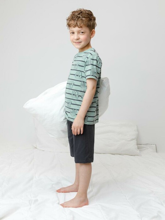 Трикотажная пижама из натурального хлопка. Футболка с короткими рукавами . У шорт эластичный пояс на резинке. Оригинальная набивка выполнена из стойких, гипоаллергенных текстильных красителей. Пижама сохраняет цвет и форму после многократных стирок. Все трикотажные полотна производятся в соответсвии с нормами Швейцарского сертификата ЭкоТекс.