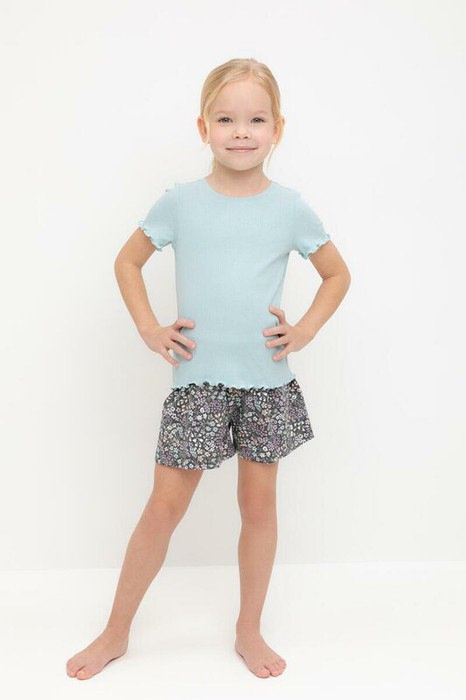 Трикотажная пижама из натурального хлопка. Футболка с короткими втачными рукавами изготовлена из эластичного трикотажа в рубчик. Шорты с эластичной резинкой в поясе выполнены из гладкого трикотажа супрем. Оригинальная набивка выполнена из стойких текстильных гипоаллергенных красителей. Изделие сохраняет цвет и форму после многократных стирок. Все трикотажные полотна производятся в соответсвии с нормами швейцарского сертификата ЭкоТекс.