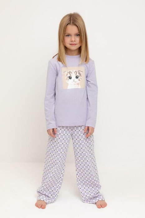 Пижама для девочки из натурального хлопка. Джемпер с длинными втачными рукавами и прямые брюки с эластичной резинкой в поясе. Оригинальная набивка и принт выполнены из стойких текстильных гипоаллергенных красителей. Изделие сохраняет цвет и форму после многократных стирок. Все трикотажные полотна производятся в соответствии с нормами швейцарского сертификата ЭкоТекс.
