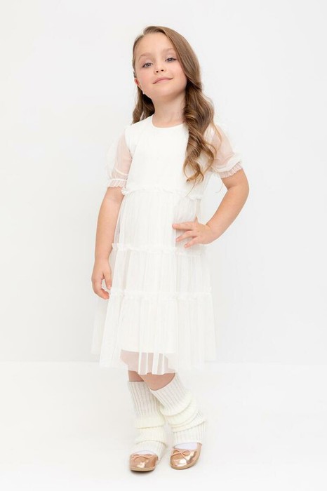Нарядное платье для девочки из высококачественного трикотажа супрем с лёгким слоем из сетки. Короткие рукава из сетки собраны на резинку. Для удобства одевания платье застёгивается на пуговицу на спинке. Платье сохраняет форму и стойкий цвет после многочисленных стирок и идеально подходит для праздников и фотосессий.