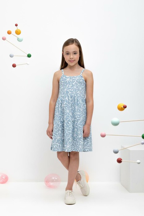 Летний сарафан для девочки из высококачественного набивного трикотажного полотна. Оригинальная набивка выполнена из стойких текстильных красителей.