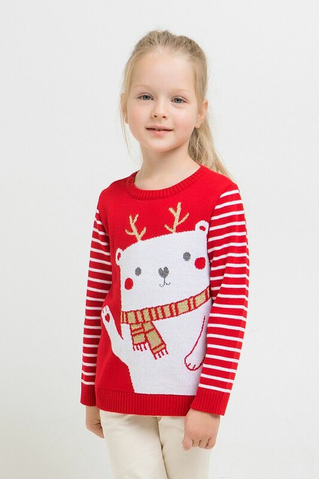 Вязаный новогодний джемпер  для девочки из акриловой пряжи. Длинные втачные рукава с вывязанными полосками. Эластичные манжеты, пояс и горловина. Спереди рисунок.