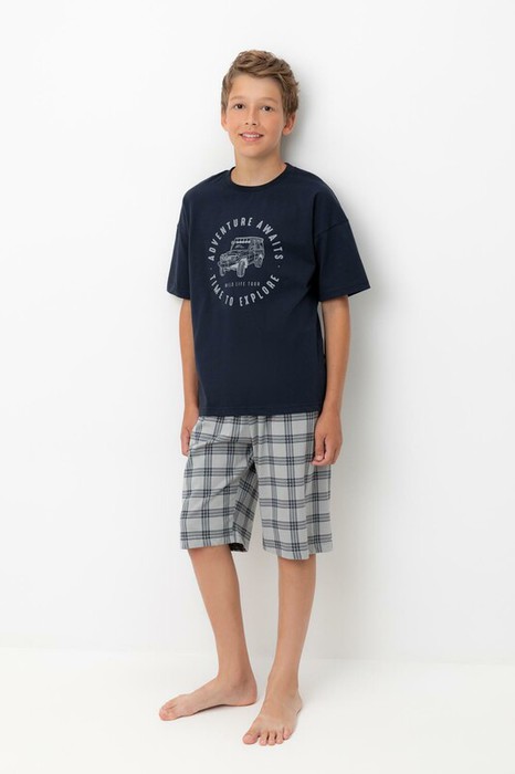 Трикотажный пижамный комплект из натурального хлопка. У футболки короткие рукава со спущенными плечами. Шорты с удобным поясом на резинке. Оригинальная набивка и принт выполнены из стойких, гипоаллергенных текстильных красителей. Все трикотажные полотна производятся в соответствии с нормами Швейцарского сертификата ЭкоТекс.