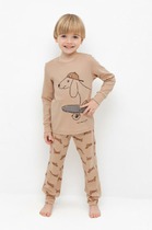 Трикотажный пижамный комплект из натурального хлопка. У джемпера длинные втачные рукава. Брюки с удобным поясом на резинке и утягивающим плетеным шнуром. Оригинальная набивка выполнена из стойких, гипоаллергенных текстильных красителей. Все трикотажные полотна производятся в соответствии с нормами Швейцарского сертификата ЭкоТекс.