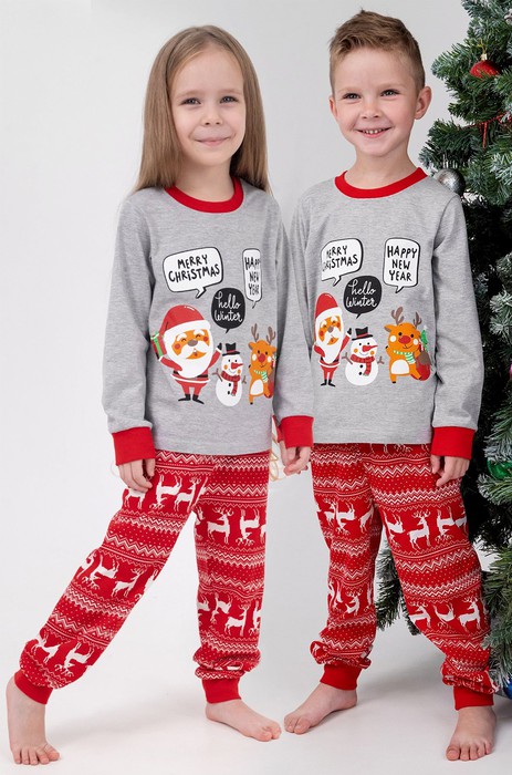 Детская новогодняя пижама с брюками выполнена из натурального 100% хлопка. Свободный крой не сковывает движений и позволяет ребенку всегда оставаться активным, а праздничный принт Дед Мороз, олень и снеговик создает уютную атмосферу и поднимают настроение. Трикотажная пижамка для мальчиков и девочек станет отличным подарком на Новый год и Рождество.