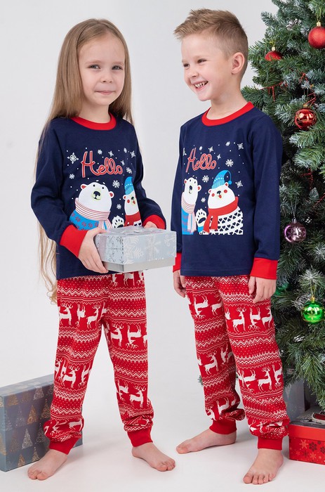 Детская новогодняя пижама с брюками выполнена из натурального 100% хлопка. Свободный крой не сковывает движений и позволяет ребенку всегда оставаться активным, а праздничный принт Мишки создает уютную атмосферу и поднимает настроение. Трикотажная пижамка для мальчиков и девочек станет отличным подарком на Новый год и Рождество.
