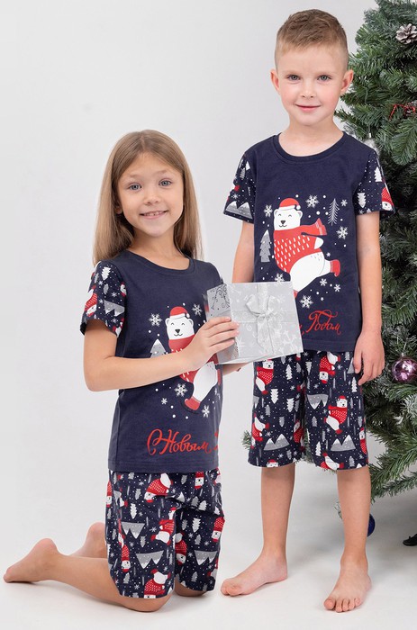 Детская новогодняя пижама с удлиненными шортами для девочек и мальчиков выполнена из натурального 100% хлопка. Свободный крой не сковывает движений и позволяет ребенку всегда оставаться активным, а праздничный принт Медведи создает уютную атмосферу и поднимает настроение. Синяя пижама для детей станет отличным подарком на Новый год и Рождество.