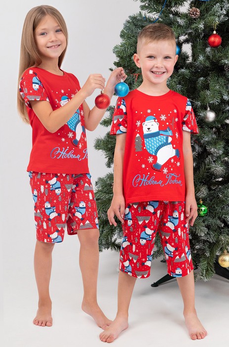 Детская новогодняя пижама с удлиненными шортами для девочек и мальчиков выполнена из натурального 100% хлопка. Свободный крой не сковывает движений и позволяет ребенку всегда оставаться активным, а праздничный принт Медведи создает уютную атмосферу и поднимает настроение. Красная пижама для детей станет отличным подарком на Новый год и Рождество.