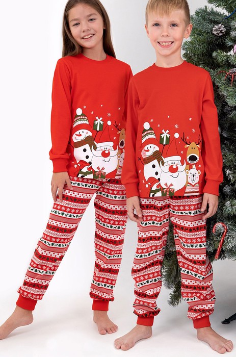 Детская пижама с брюками выполнена из натурального 100% хлопка. Свободный крой не сковывает движений и позволяет ребенку всегда оставаться активным, а яркий красный цвет и праздничный принт снеговик создают праздничную атмосферу и поднимают настроение. Пижамка для мальчиков и девочек станет отличным подарком на Новый год и Рождество.