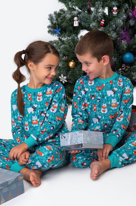 Детская пижама с брюками выполнена из натурального 100% хлопка. Свободный крой не сковывает движений и позволяет ребенку всегда оставаться активным, а яркий бирюзовый цвет и праздничный принт создают уютную атмосферу и поднимают настроение. Пижамка для мальчиков и девочек станет отличным подарком на Новый год и Рождество.