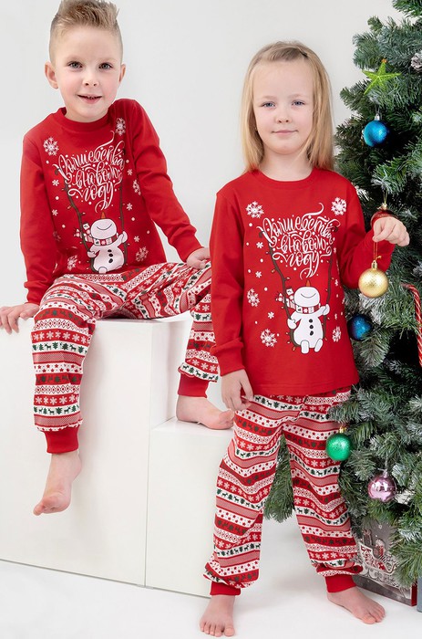 Детская пижама с брюками выполнена из натурального 100% хлопка. Свободный крой не сковывает движений и позволяет ребенку всегда оставаться активным, а яркий красный цвет и праздничный принт снеговик создают праздничную атмосферу. Пижамка для мальчиков и девочек станет отличным подарком на Новый год и Рождество.