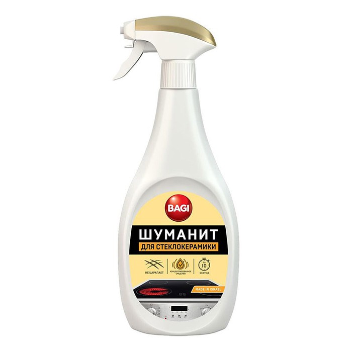 Мгновенно удаляет въевшиеся, стойкие и подгоревшие жировые загрязнения со стеклокерамических и индукционных плит любого типа, варочных панелей, кастрюль и т.п. спрей Bagi Шуманит.