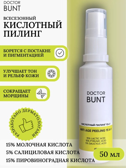 * Формула с молочной и пировиноградной кислотой (по 15%) эффективно обновляет кожу, а салициловая кислота (5%) помогает от прыщей анке и черных точек.