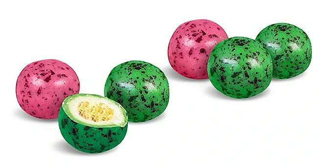 Драже красного цвета в забавную крапинку – со вкусом клубники и кислинкой, драже зелёного цвета – со вкусом лайма и кислинкой.