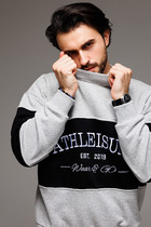 Мужской свитер прямого силуэта с округлой горловиной. По горловине, низу изделия и рукавов - резинка. Передняя полочка из фактурного трикотажа, рукава и спинка гладкие