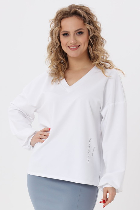 Джемпер прямого силуэта с разрезами в боковых швах. V-образный вырез горловины удлинит шею и визуально вытянет силуэт. Рукав втачной длинный со спущенной линией плеча, по низу рукава сборка и притачная манжета. По низу переду выполнена декоративная надпись.