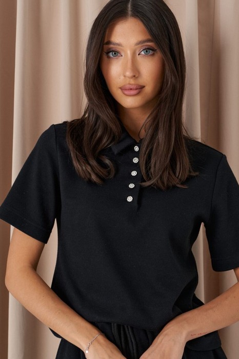 Джемпер-поло прямого кроя. Выполнен из мягкого трикотажа чёрного цвета. Воротник отложной. Застёжка на 3 пуговички на планке. Рукав втачной, короткий. Длина спинки 54 см. Длина рукава от линии втачивания 20 см