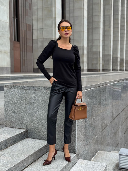 Джемпер трикотажный, прямого силуэта. Лиф обработан вырезом каре, рукав втачной, прямой, по верху присборен