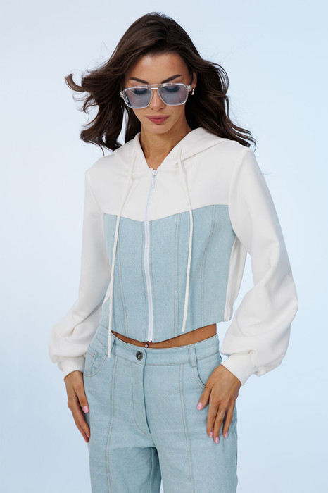 Стильный джемпер полуприлегающего силуэта из джинса и трикотажного полотна с втачным рукавом внизу на манжете из довяза. Полочка с имитацией корсета из джинсовой ткани с центральной застежкой на тесьму-молнию и фигурным низом. Спинка внизу на резинке. Джемпер с капюшоном и втянутым в него шнурком.