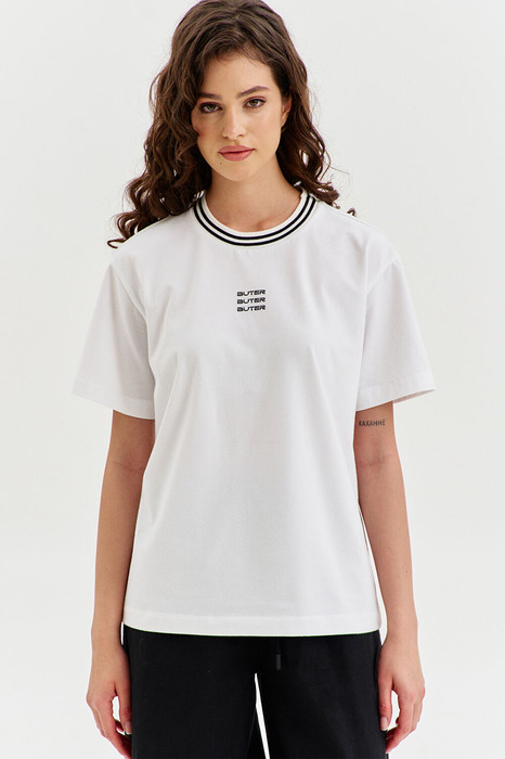 Джемпер трикотажный прямого силуэта с встачным коротким рукавом. По переду печать "BUTER". По горловине планка из декоративного довяза.