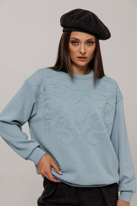Джемпер из технологичного трикотажного полотна с эффектом peach. Прямого силуэта с втачным рукавом и спущенной линией плеча, с манжетой из основной ткани по низу рукава. По переду вышивка "Орнамент". По горловине и низу изделия притачная планка из основной ткани.