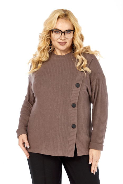 Очень уютный, практичный джемпер из мягкого трикотажа полуприлегающего силуэта. Горловина округлой формы. На передней части изделия расположена асимметричная планка с имитацией застежки на пуговицы. Линия плеча спущена, рукав втачной. Низ рукава обработан притачной манжетой.
