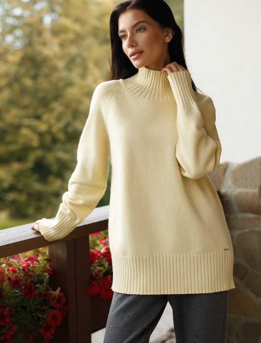 Состав: 52%ПАН (акрил) 33%ПЭ 8%ПУ 7%Кашемир Плотность: 7 GG Размер товара на первом фото: 42Джемпер с воротом стойка выполнен из мягкой пряжи с кашемиром. Модель свободного силуэта с рукавом реглан будет стильно сочетается с брюками и джинсами. Мягкая пряжа очень приятная к телу, поддержит комфорт на протяжении всего дня, при этом не перегревая. Сочетается в костюме с брюками D38.013, D38.012 и юбкой D36.016