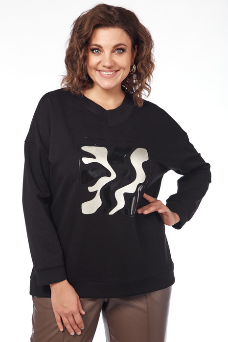 Джемпер женский прямого силуэта, изготовлен из трикотажного полотна с однотонными довязами по горловине, низу изделия и низу рукавов. Горловина V-образной формы. По переду выполнена декоративная печать. Рукав спущенный, длинный.