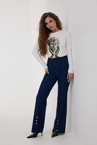 Элегантный джемпер-кейп прямого свободного силуэта. Горловина с цельнокроеным воротником-стойкой. Рукав втачной широкий, от линии локтя до запястья есть дополнительное отверстие для рук.