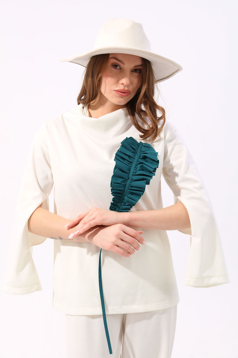 Джемпер-кейп прямого свободного силуэта. Горловина с цельнокроеным воротником-стойкой. Рукав втачной широкий, от линии локтя до запястья есть дополнительное отверстие для рук. Декорирован элементом из контрастной ткани.
