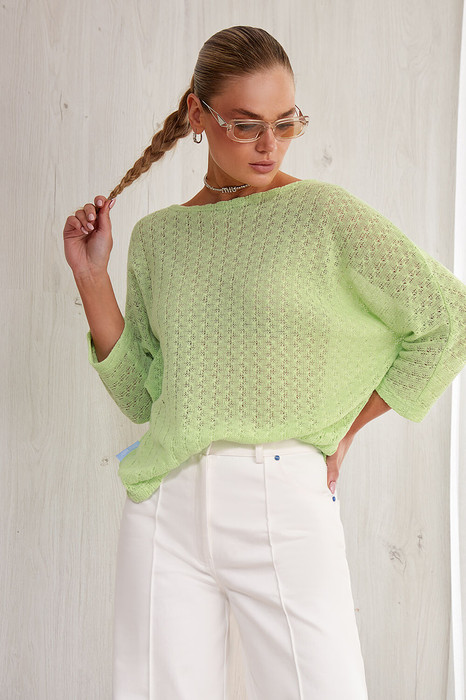 Вязаный объемный джемпер прямого силуэта из хлопка. Перед и спинка изделия прямые. Горловина – “лодочка”. Рукав спущенный, цельнокроеный. Спинка прямая. Декоративный авторский флажок в боковом шве блузы.